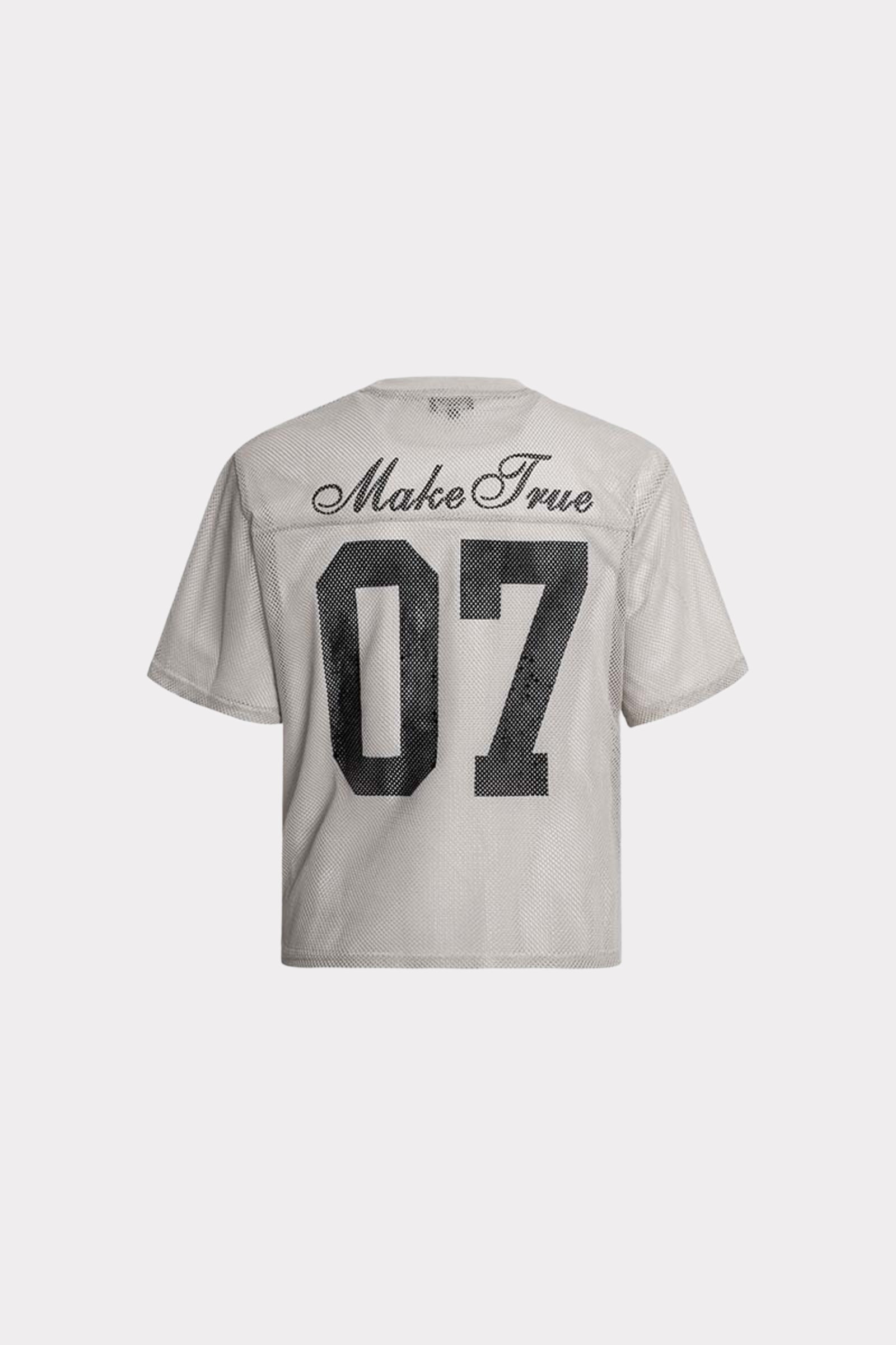 Breathable mesh jersey tee with bold varsity-inspired graphics. Designed for a loose streetwear fit, this top combines sports energy with a retro aesthetic, making it a standout layering piece for summer.